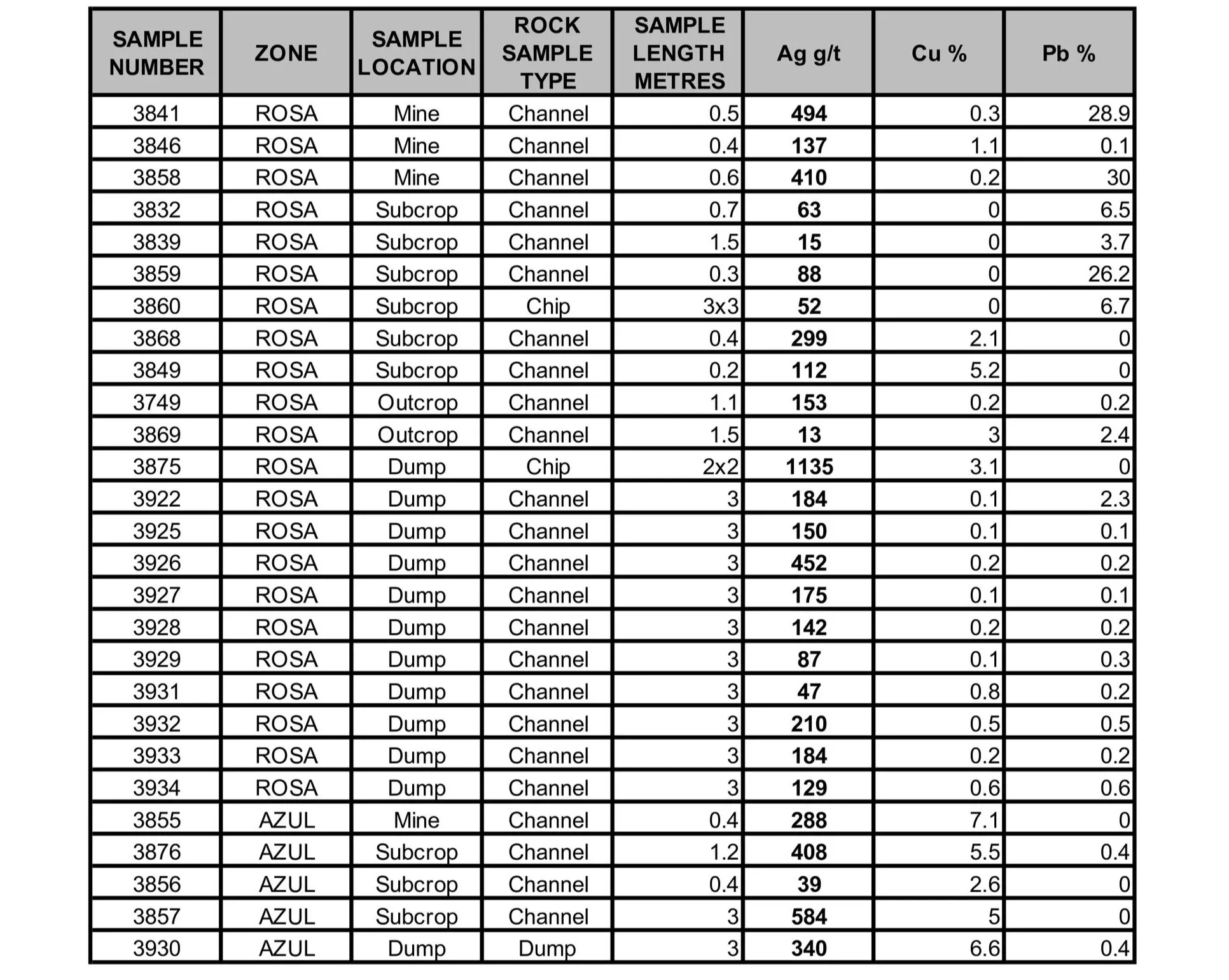 The Rosa and Azul zones, where the Tacaza volcanics are shallowest and closest to the limestone contact zone, previously returned rock sample values up to 1,135 g/t Ag, 5.2% Cu, 0.69% Mn and 584 g/t Ag, 7.1% Cu, 0.47% Mn respectively. Select chip sampling from old mine workings at the Rosa and Azul zones include: