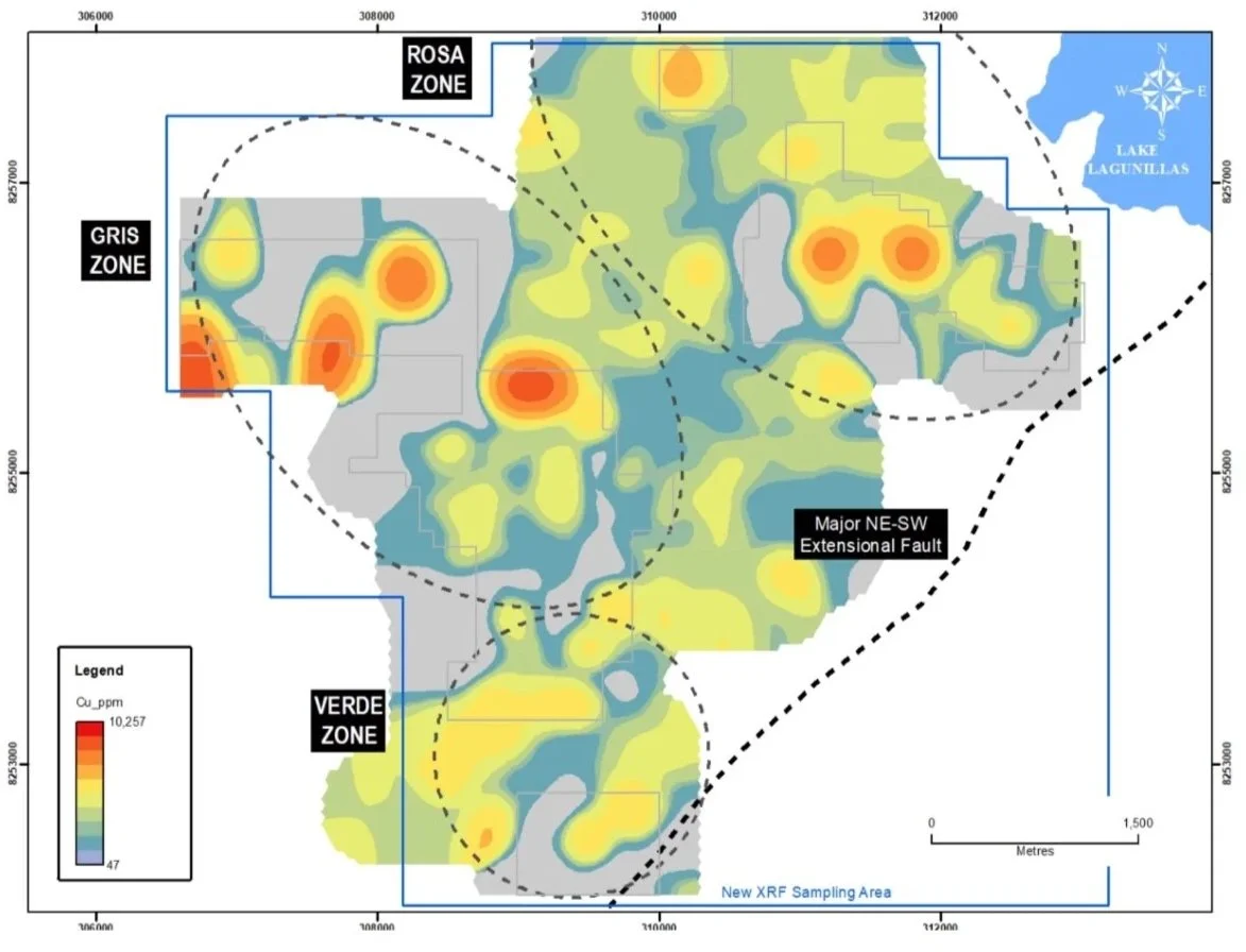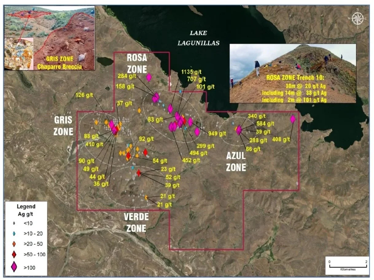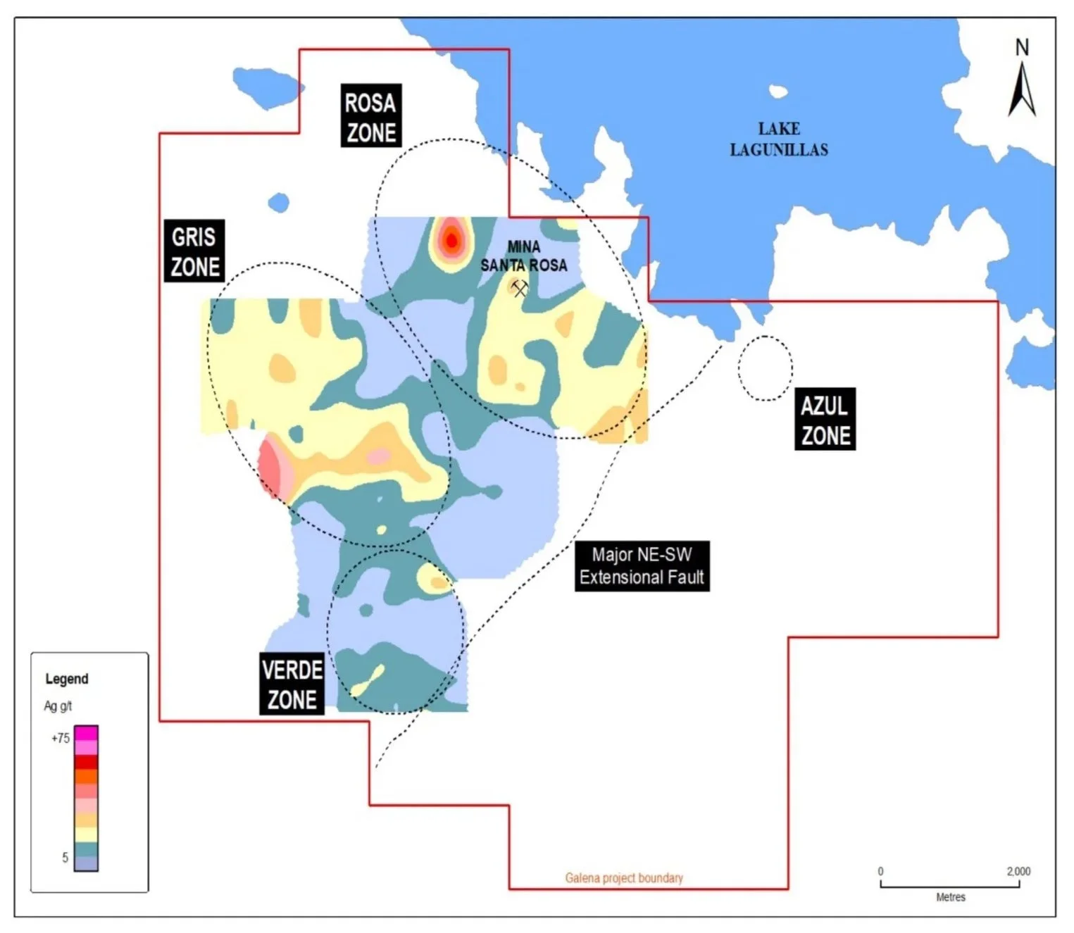 Sampling from the Verde and Gris zones since 2021 has identified large anomalous zones hosting galena and copper oxide mineralization associated with low temperature alteration assemblages These zones are interpreted to represent possible remobilization of silver rich galena, and copper mineralization source at depth. Select results from mineralized intervals returned results as follows: