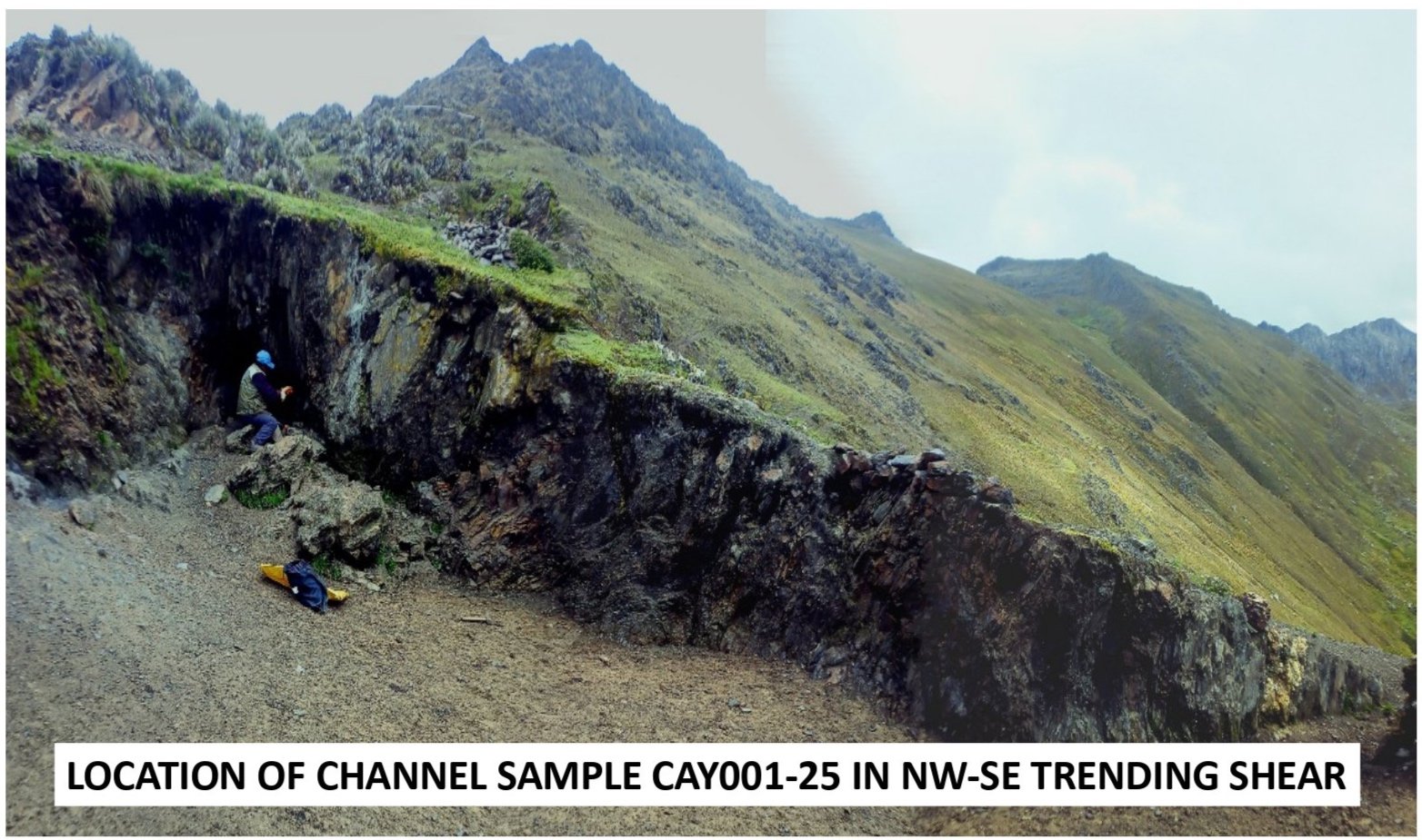 The gold mineralization observed at Cayos occurs within broad, 5-20 metre wide shear zones hosted in Devonian-aged, metamorphosed shale, siltstone and sandstone. The areas with multiple quartz veins within the shear zones host the best continuous gold channel samples to date, and are commonly located at the intersection of major structural breaks, of both Hercynian and Andean ages.