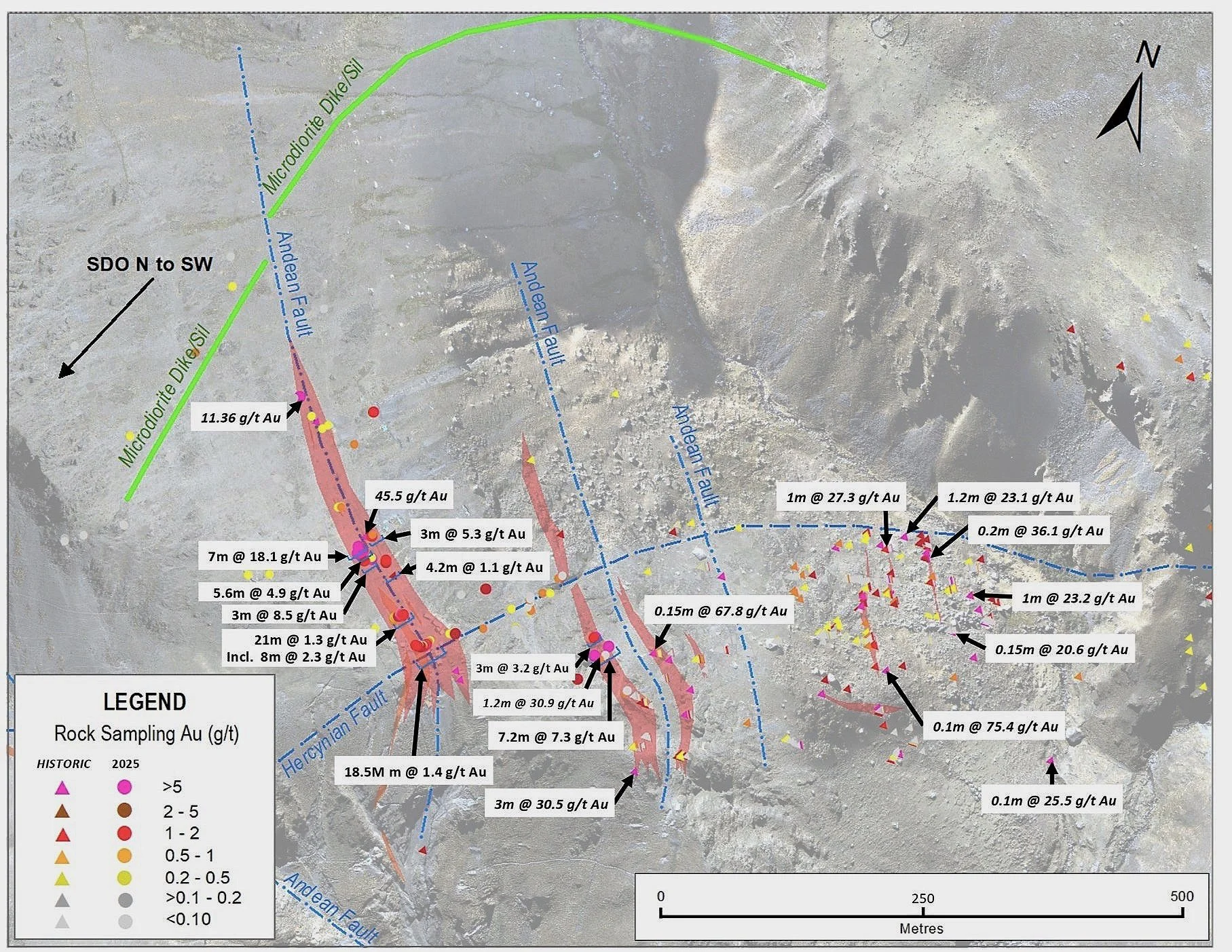 In April 2025, ongoing mapping and sampling was designed to systematically test the continuity of gold-bearing structures and to map the main geological controls, aimed at guiding the upcoming drill program. Systematic channel sampling in completely new areas has returned the following select results and most significant surface geochemical results to date at Usicayos: