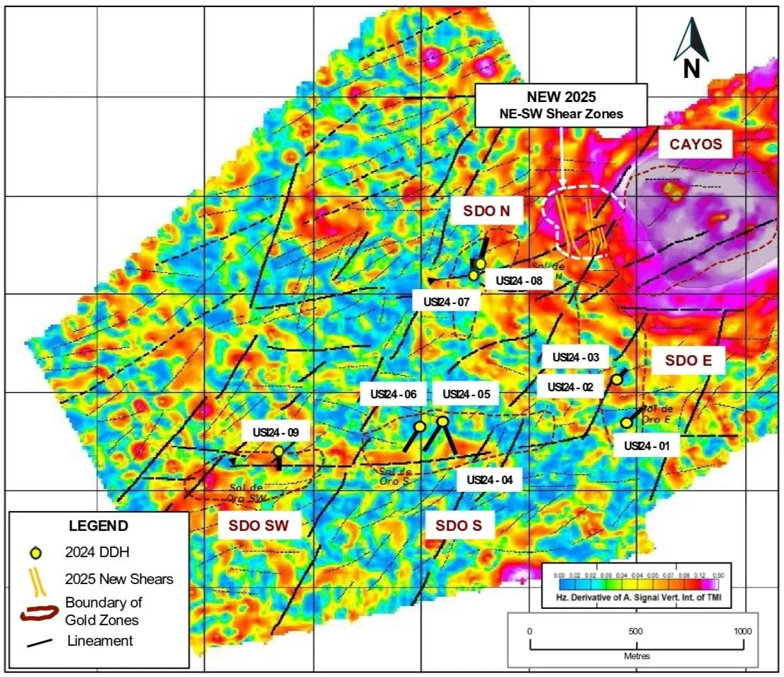 Palamina Corp. (TSXV:PA, OTCQB:PLMNF): As the 2024/2025 rainy season ends in south eastern Peru, Palamina has resumed mapping and sampling in the Sol de Oro North (“SDO N”) and Cayos zones at its 100% owned Usicayos gold project. Palamina is revising its 2025 drill program plans to test each zone, both of which are permitted for drilling. The two best drill intercepts of the 2024 drill program were obtained from SDO N where the Cayos zone is located to the north east. The most recent sampling of rock outcrop was carried out in the gap between the known mineralized zones and has defined several new NW-SE shear zones with superior gold grades and widths in the western portion of the Cayos zone. The Cayos zone has never been drill tested.