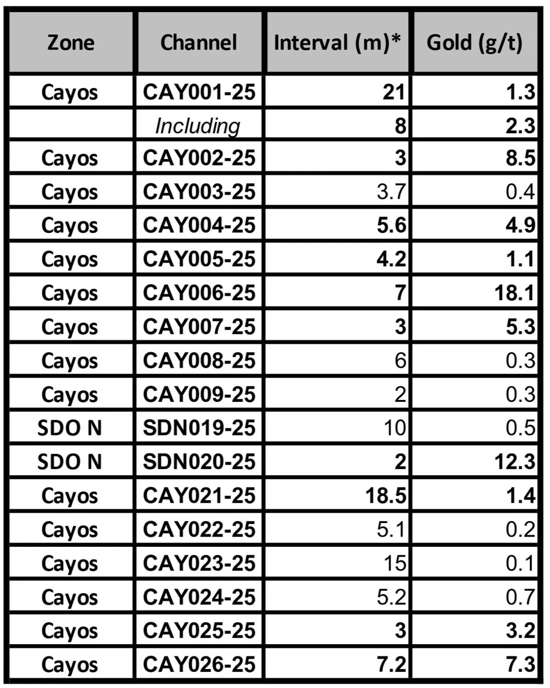 “Sampling in the Cayos zone has identified previously unknown high grade gold systems within two new NW-SE shear zones. The most significant channel sampling results were from the western most shear which returned 18.1 g/t Au over 7 metres from west to east. The current strike length of the western most shear is at least 350 metres in length and remains open in both directions. In 2025, Palamina plans more drilling in the SDO N zone to the south, to test for a possible mineralized feeder zone target between SDO N and SDO S where structures converge and conduct a maiden drill program in the Cayos zone.” commented Andrew Thomson, President and CEO of Palamina.
