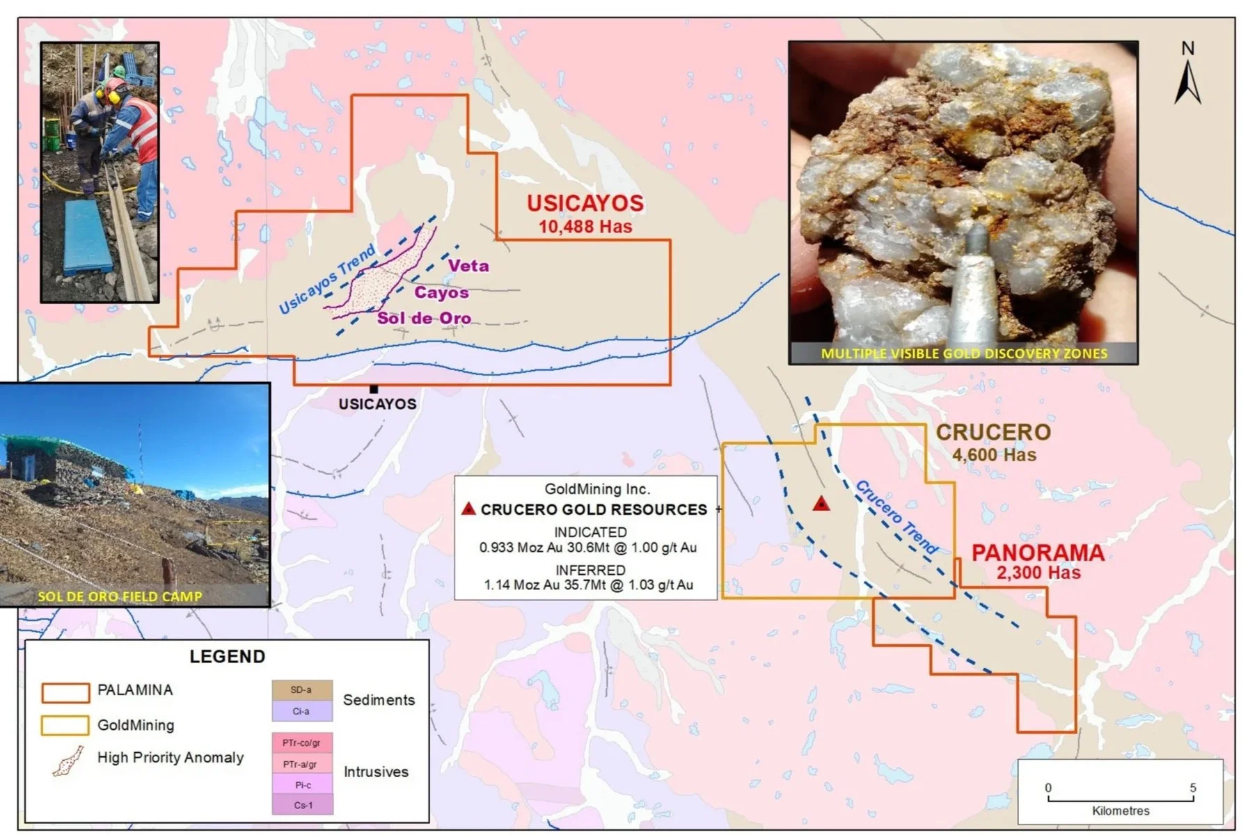 Panorama represents a possible southwest extension to GoldMining Inc.’s (TSX:GOLD) Crucero gold deposit. The Panorama application area sits within the Ananea formation and same regional structural corridor as Palamina’s Usicayos Gold Project and Gold Mining’s Crucero Gold deposit.