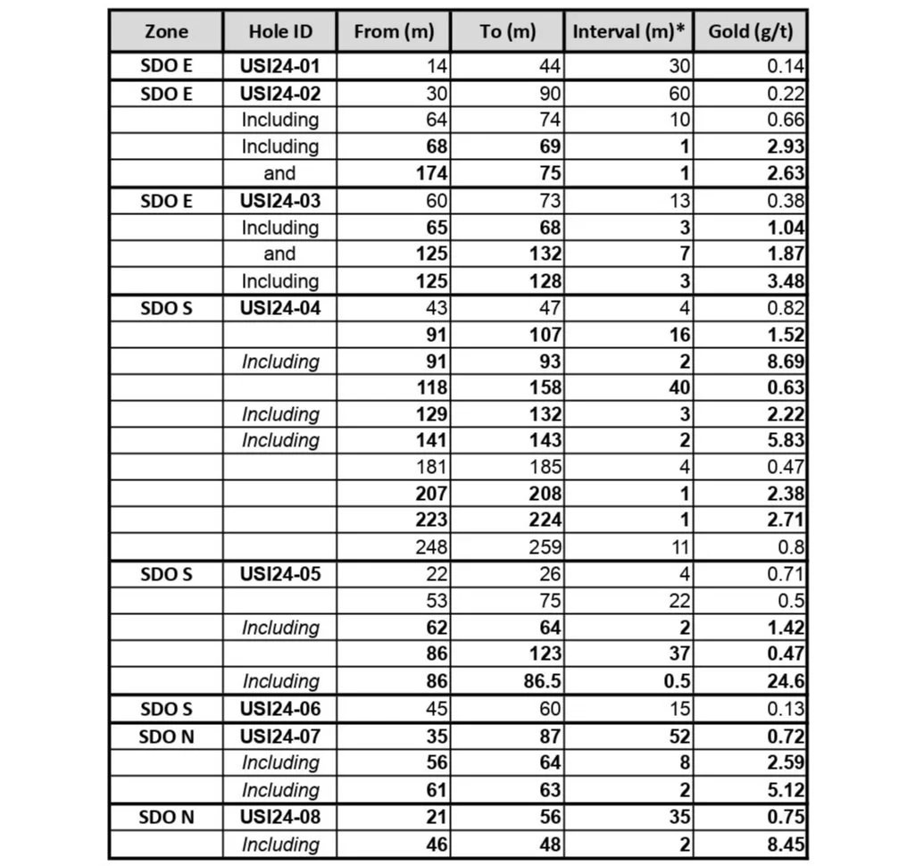 At SDO S, drillhole USI24-04 intercepted a mineralized blind microdiorite intrusive 113 metres down hole, with gold mineralization associated with pyrite and pyrrhotite, occurring as disseminations and in massive sulfide veinlets. USI24-05 is a scissor hole drilled from the same platform. Mineralization at SDO S dips to the north on the south end of the flower structure. Both drillholes intercepted multiple visible gold zones associated with pyrite and pyrrhotite.